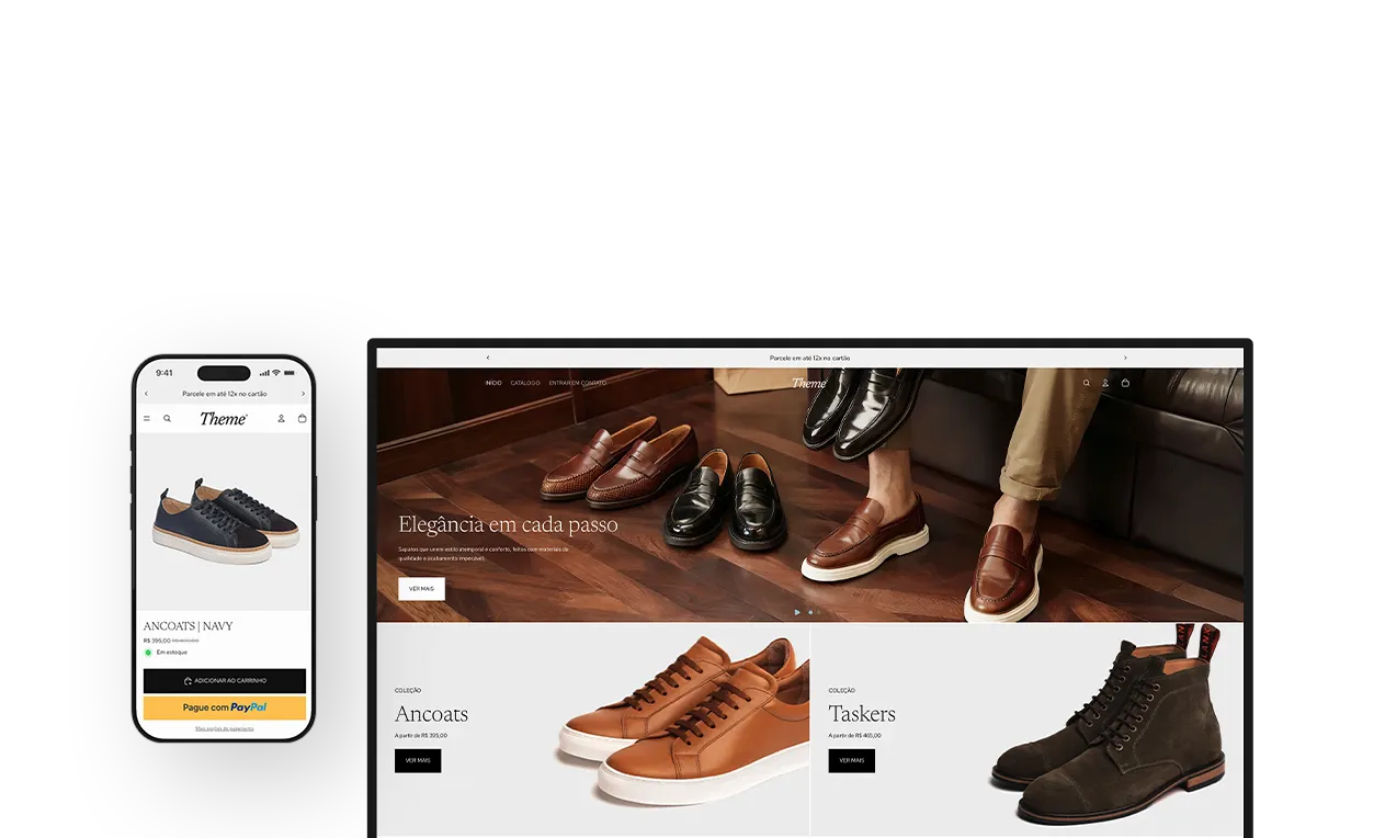 Loja virtual. Sua marca no ar com uma estrutura Shopify pronta para vender pro mundo inteiro.
